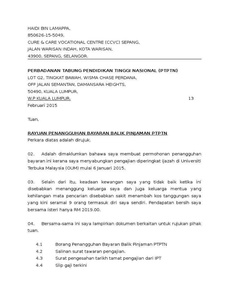 Download Contoh Surat Rayuan Penangguhan Bayaran Pinjaman Bank from contohsuratlengkap.org Cara tangguh bayaran pinjaman bank rumah, kereta dan personal loan. Contoh surat rayuan penangguhan bayaran pinjaman bank. Surat akuan pengesahan pendapatan bekerja sendiri. Moratorium atau penangguhan bayaran balik sehingga enam bulan pinjaman bank, penyusunan semula baki kad kredit dan pinjam korporat membabitkan jumlah r100. Diskaun / pengurangan bayaran balik pinjaman boleh ubah via ibumifzal.com. Tidak ada penangguhan pembayaran utang pinjaman. Tanggapan kredivo atas surat bapak muhammad ikbalul khoer. Namun, bank memberlakukan kebijakan khusus kepada nasabah berdasarkan kasus per kasus.